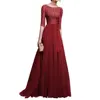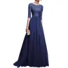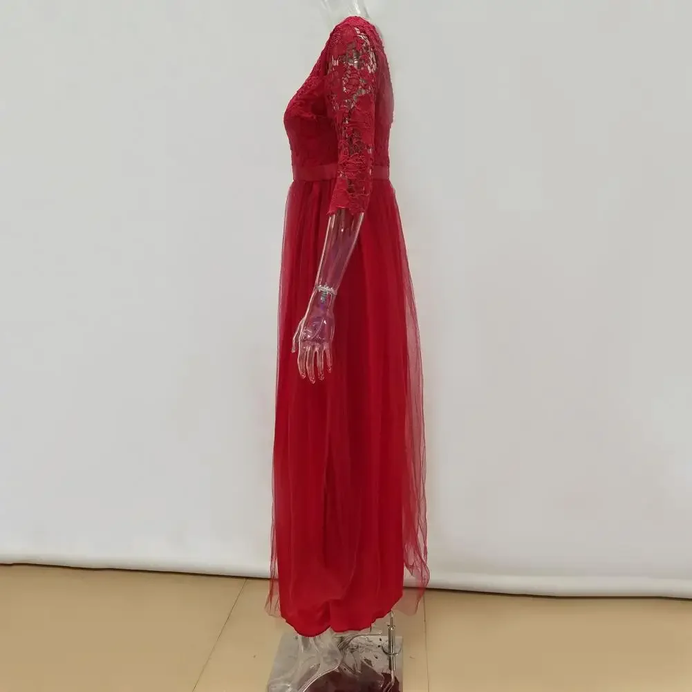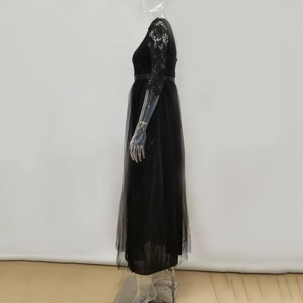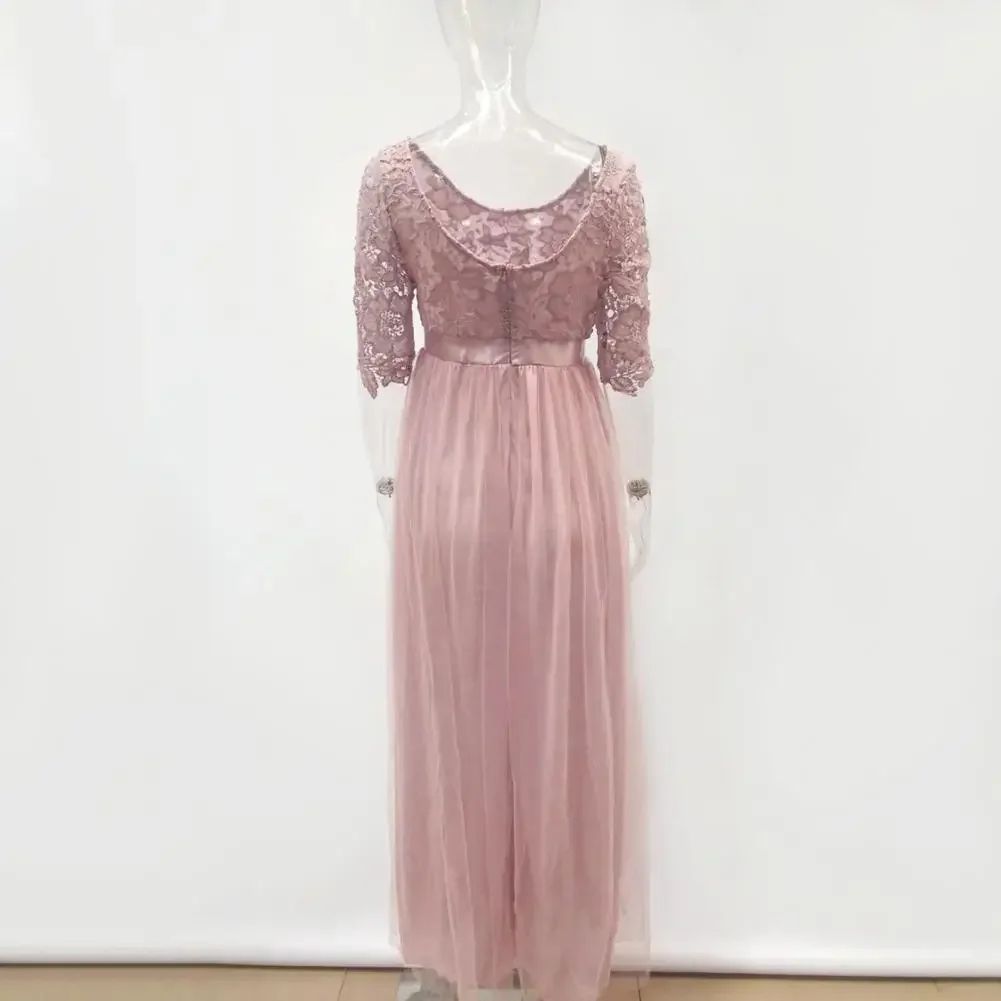 Women Prom Party Dress Round Neck Lace Flower Embroidery Half Sleeve Tight Waist Patchwork Floor Length Pleated Lady Fall Winter Maxi Evening Dress