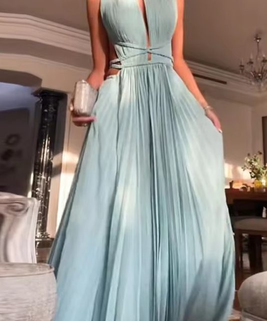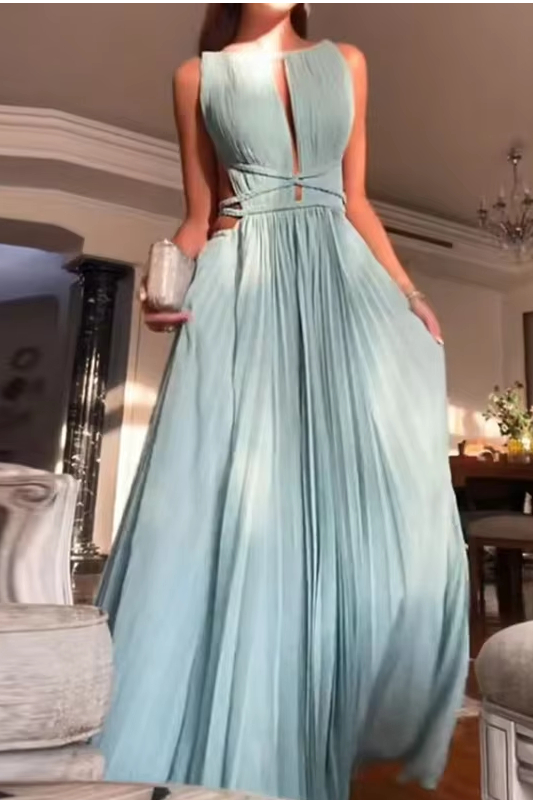 Victoria’s Vogue Women O-neck High Waist Pleated Long Dress Sexy Hollow Out Backless Swing Beach Dress Spring Summer Sleeveless Solid Party Dress