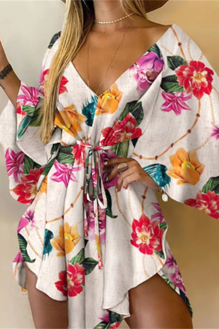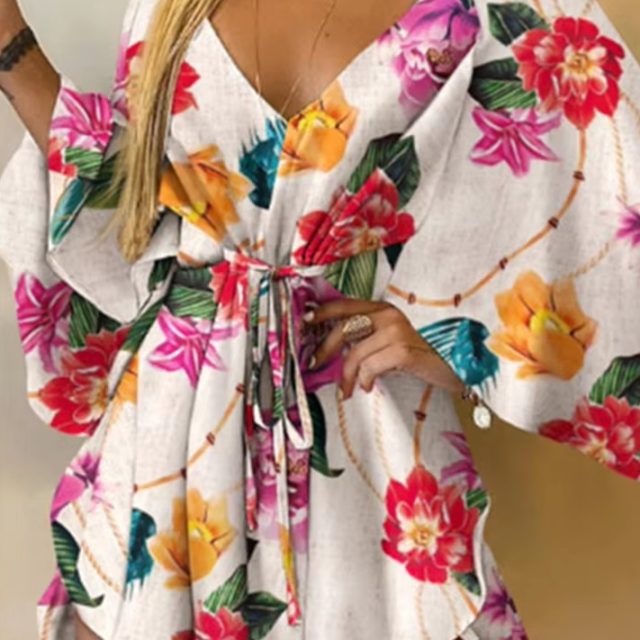 Victoria’s Vogue Women Print Dress Sexy V-Neck Bat Sleeve Ruffl Flowers Print Bohemian Beach Sundress Ladies Loose Summer Vacation Mini Dresses