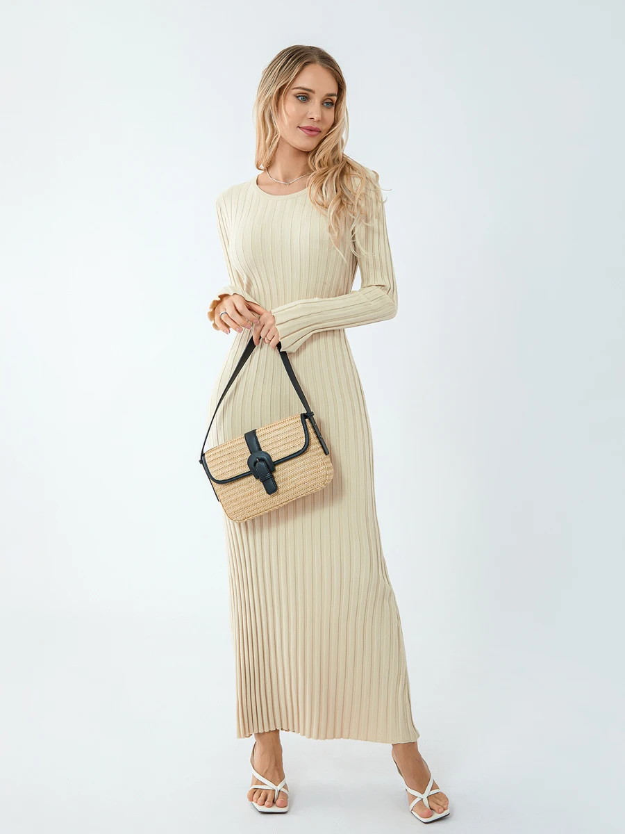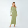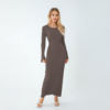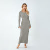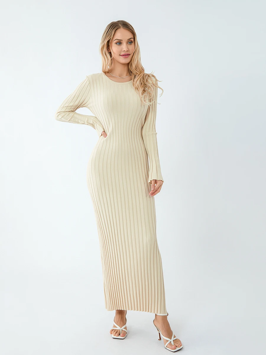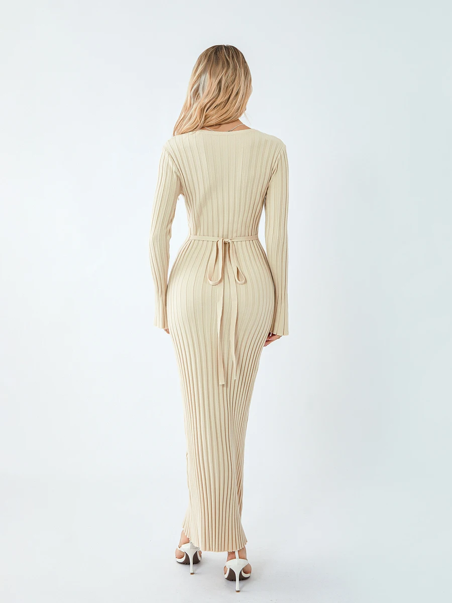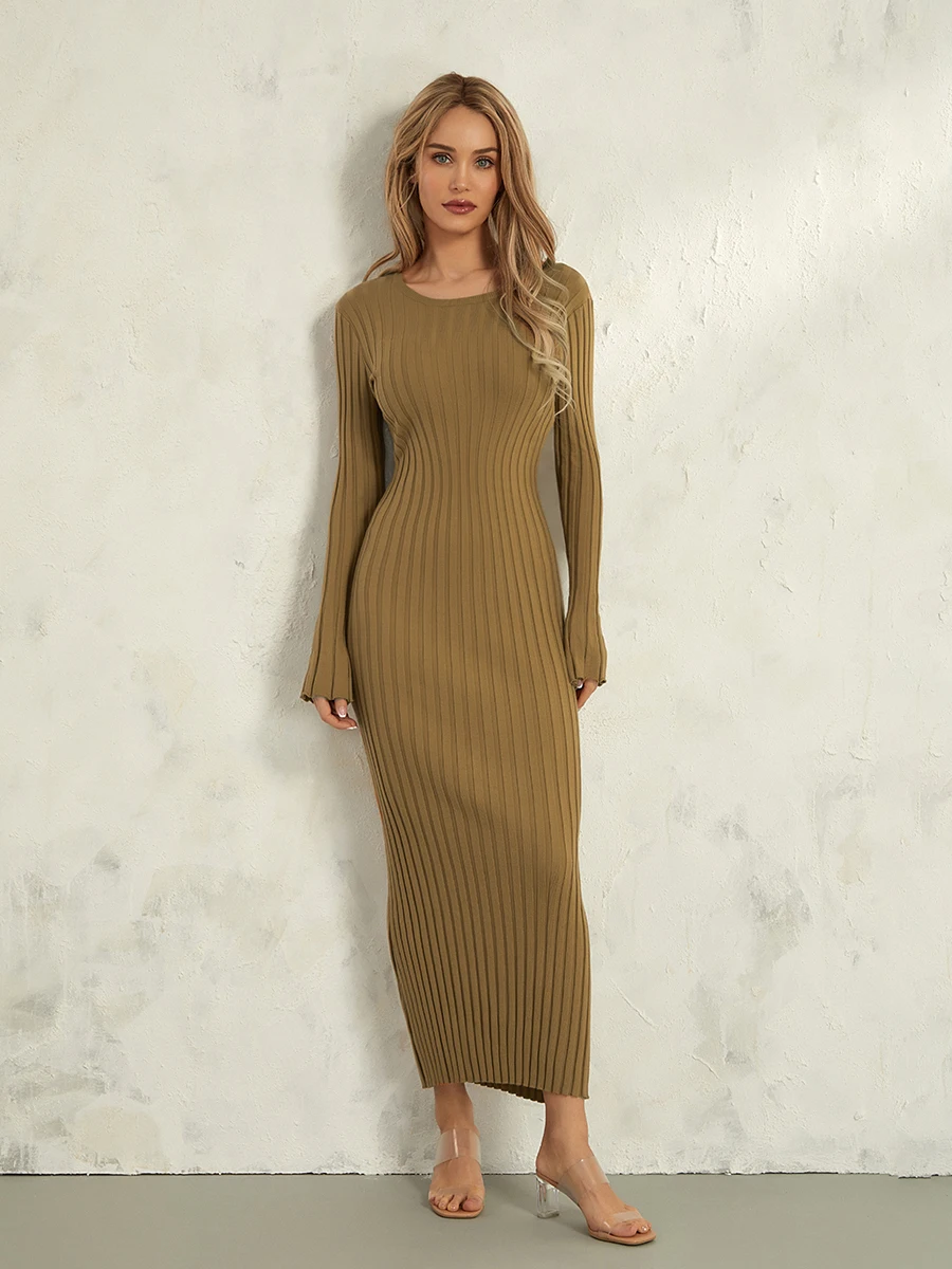 Victoria’s Vogue Women Spring Autumn Lace-up Knit Dress Elegant Long Sleeve Crew Neck Ribbed Solid Color Long Dress Streetwear