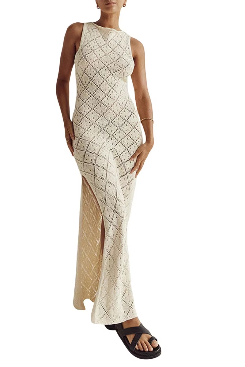 Victoria’s Vogue Women Wrapped Dresses Round Neck Sleeveless Cutout Knitting Solid Midi Party Street Summer Dress