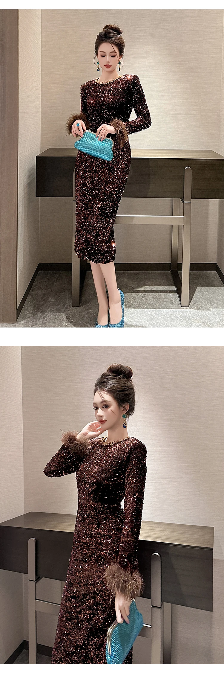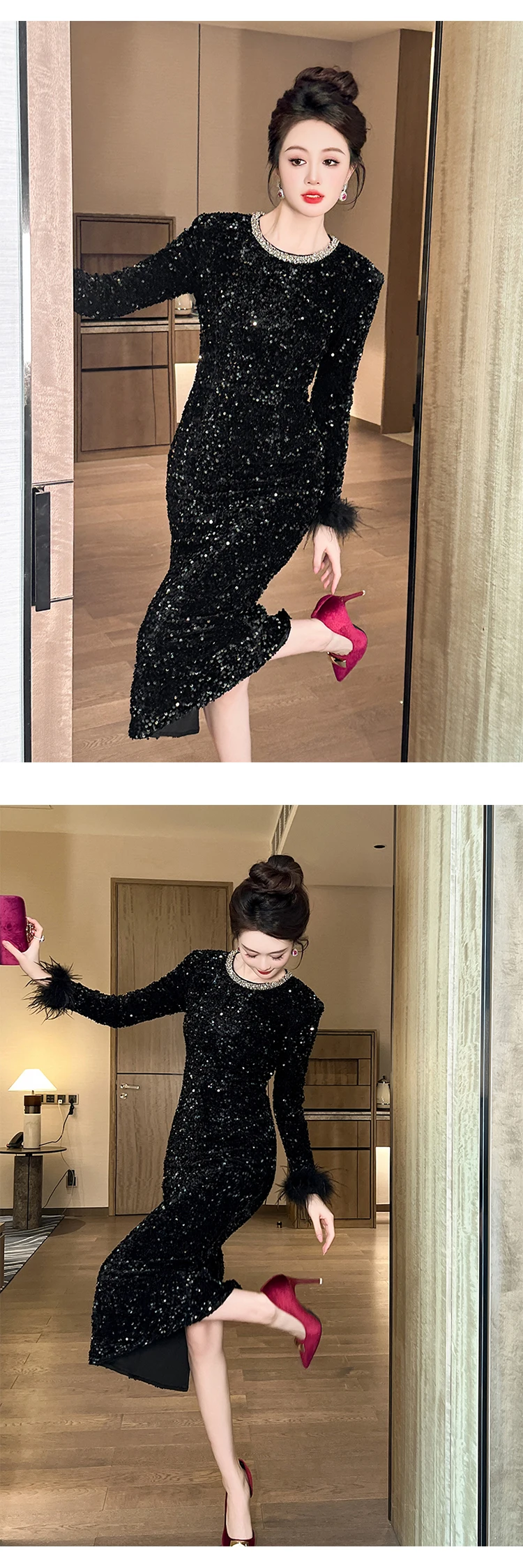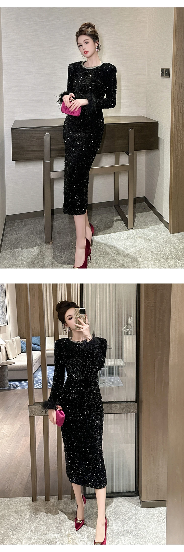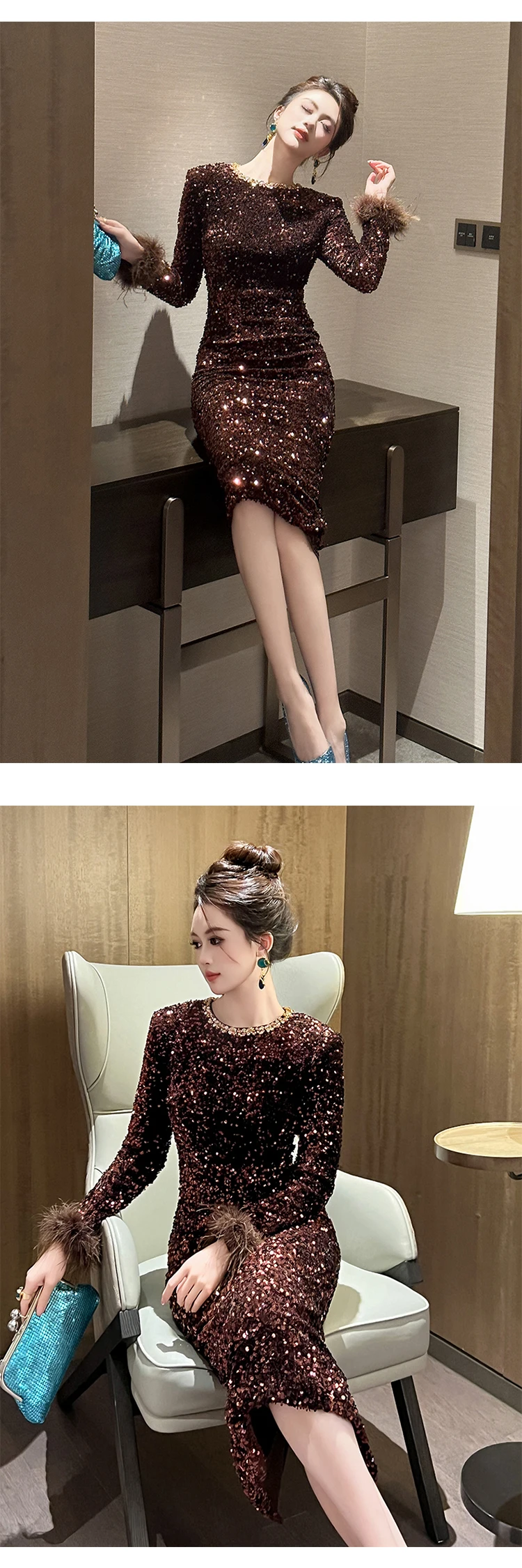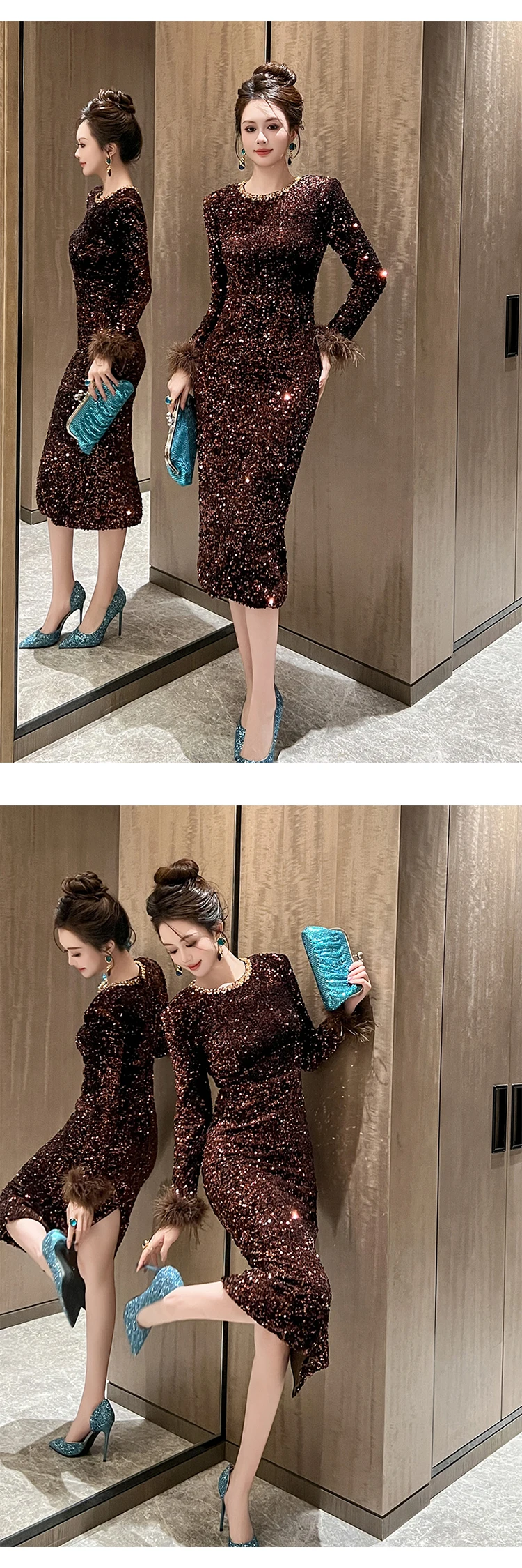 Victoria’s Vogue Women’s Clothing Luxury Retro Prom Dress Female Elegant Elastic Velvet Fur Long Sleeve Bodyocn Robe Lady Cocktail Party Vestidos