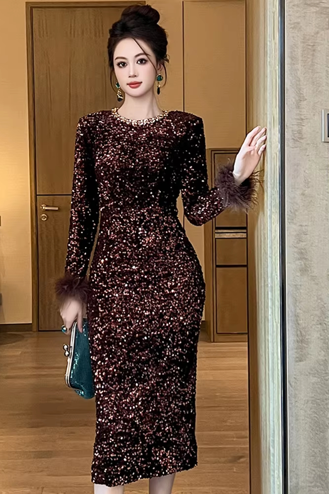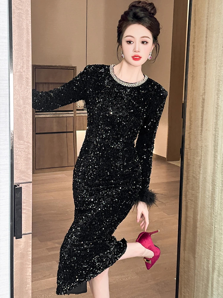 Victoria’s Vogue Women’s Clothing Luxury Retro Prom Dress Female Elegant Elastic Velvet Fur Long Sleeve Bodyocn Robe Lady Cocktail Party Vestidos