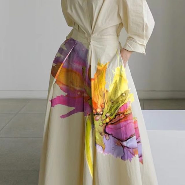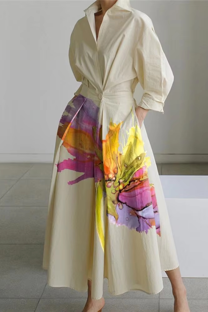 Victoria’s Vogue Women’s Dress 2025 Spring Summer Flower Printed Lapel Collar Long Sleeves High Waist Pleated Dress Casual A-line Dress