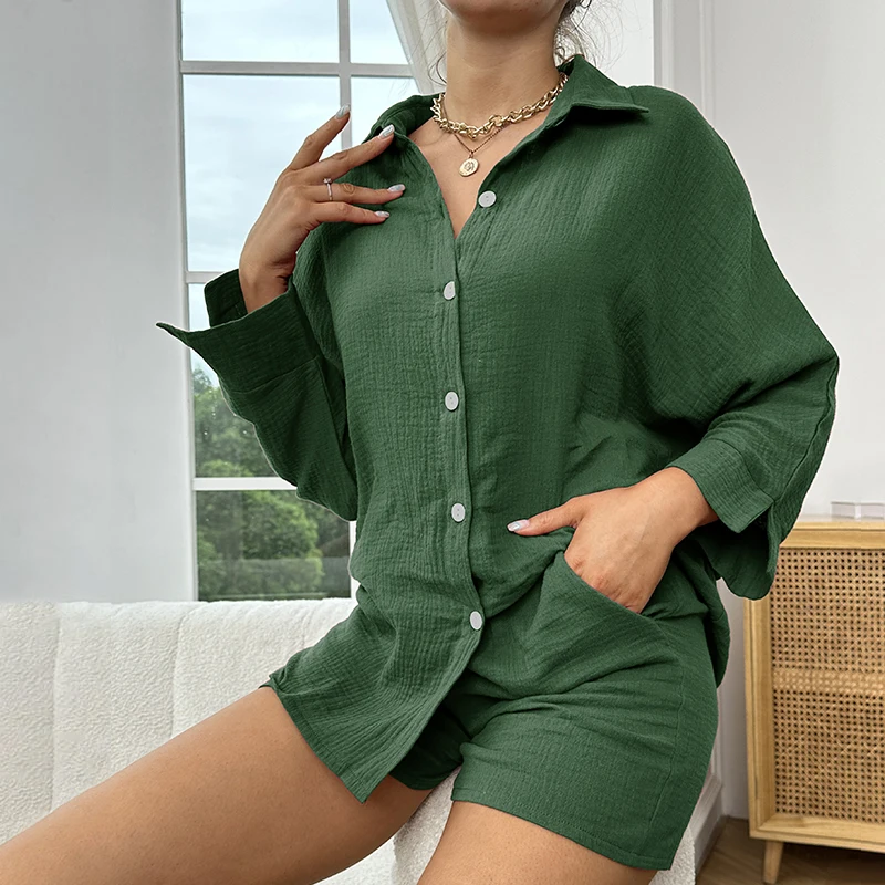 Victoria’s Vogue Women’s Nightwear Cotton Lounge Pajama Set Long Sleeve Lapel Neck Top With Shorts Two Piece Sleepwear Summer Casual Loungewear