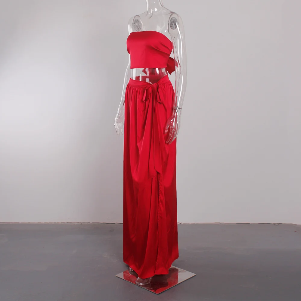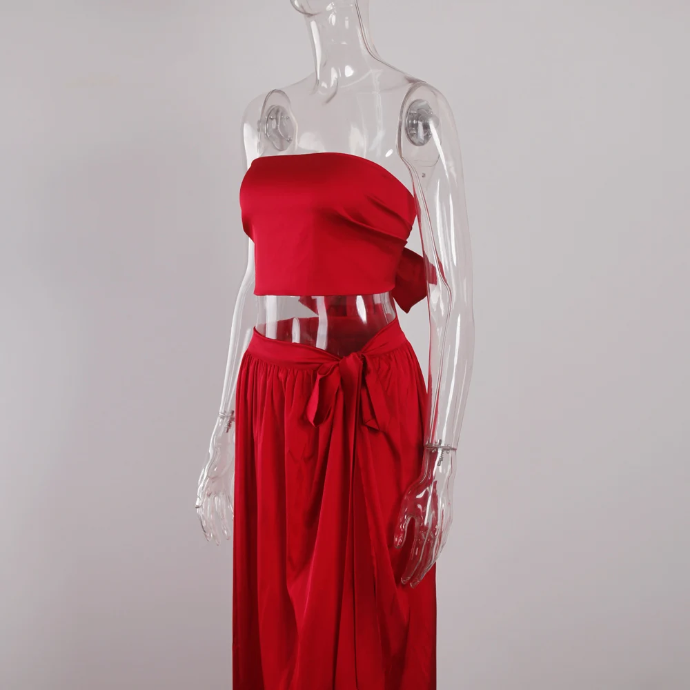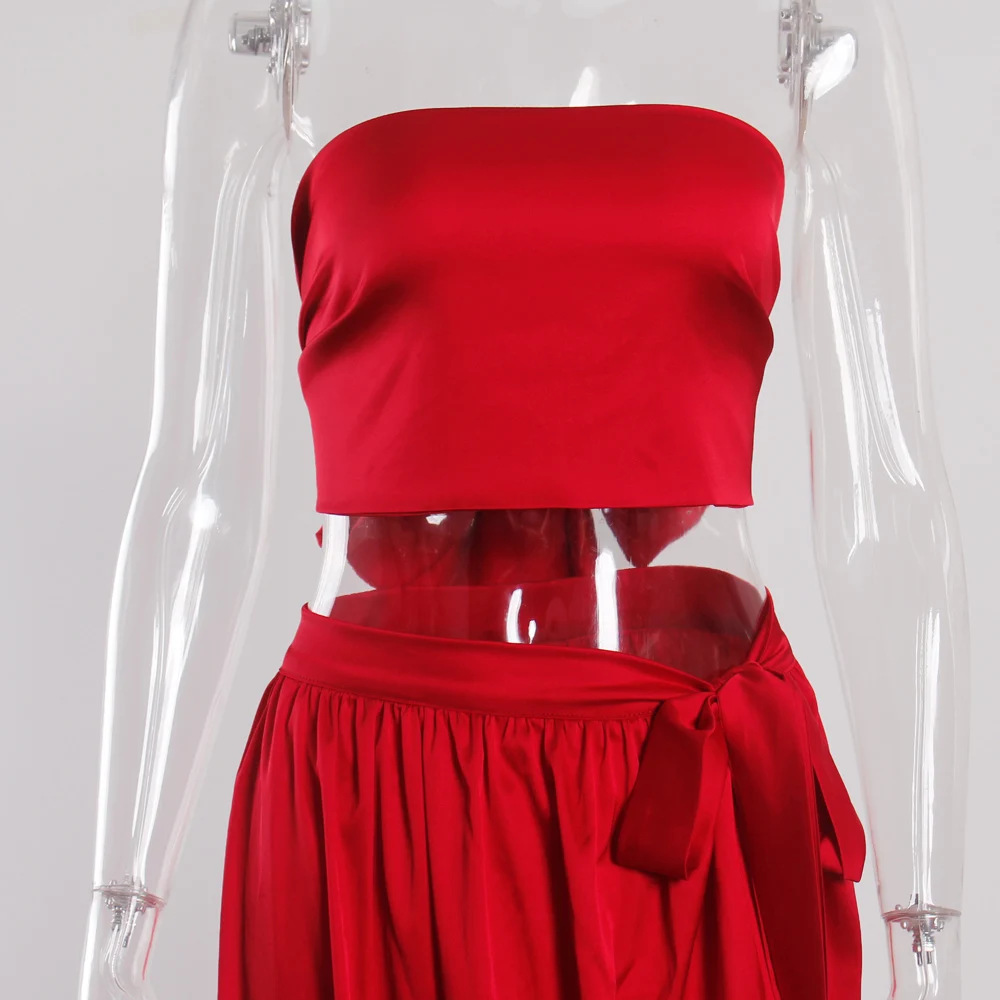 victoria’svogue 2021 Women’s Sexy Satin 2 Pieces Tie Up Set DIY Party Tops Lace Up Skirt High Slit Summer Beach Wear