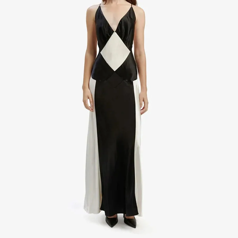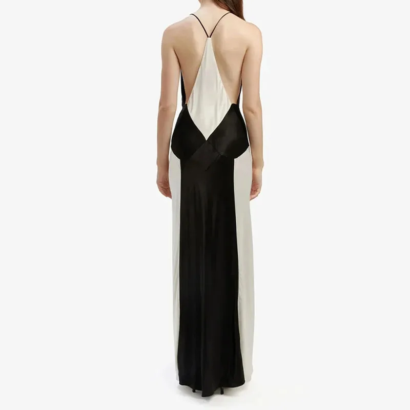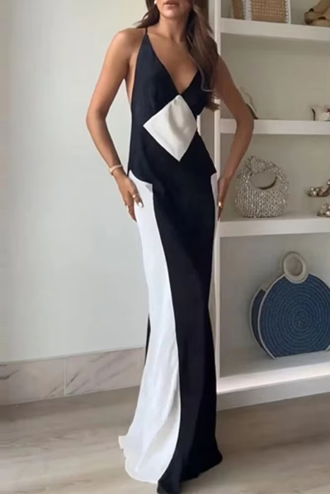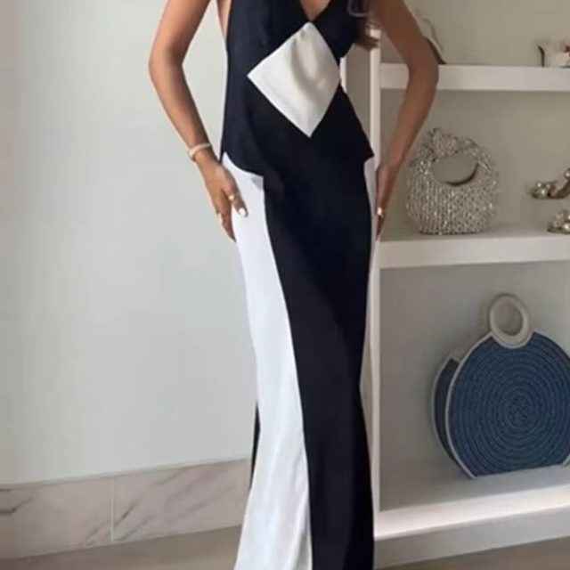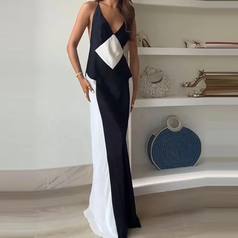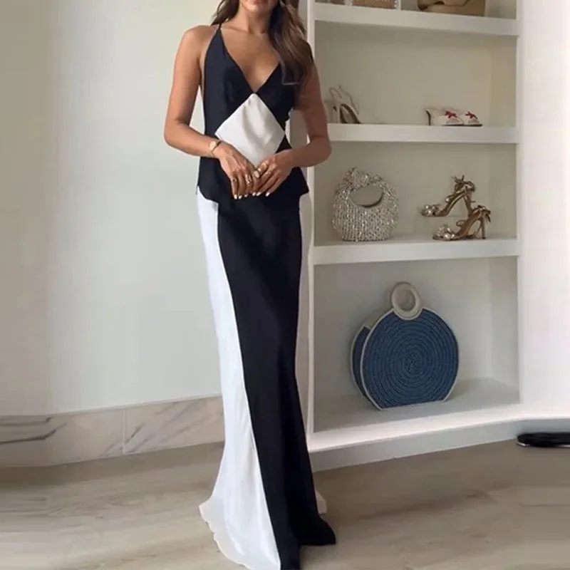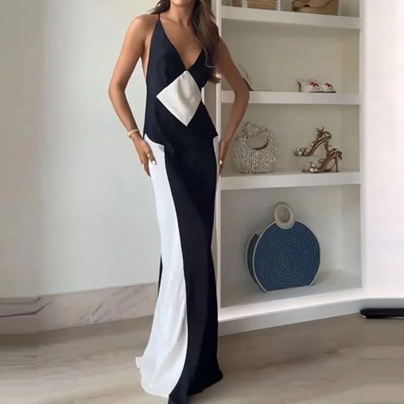 Victoria’s Vogue Women’s Sexy V-neck Sleeveless Long Dress Fashion Hight Waist Draped Party Dresses Elegant Black White Contrast Suspender Dress