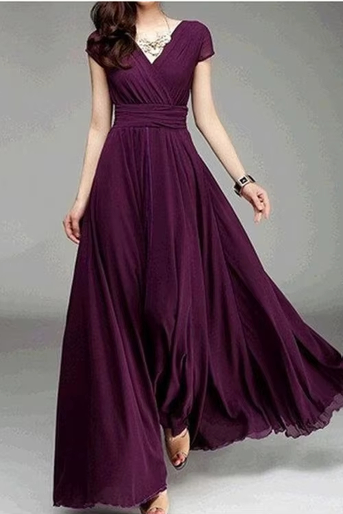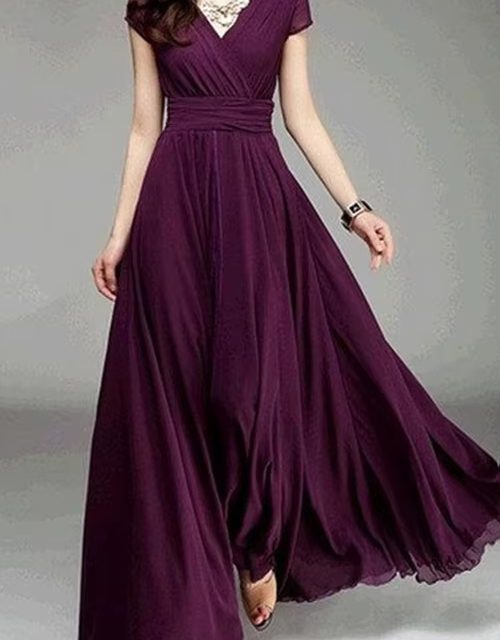 Victoria’s Vogue Women’s Short-Sleeved Chiffon Evening Dress, Female Party Dress, Monochromatic, Bohemian, Long, Elegant, New