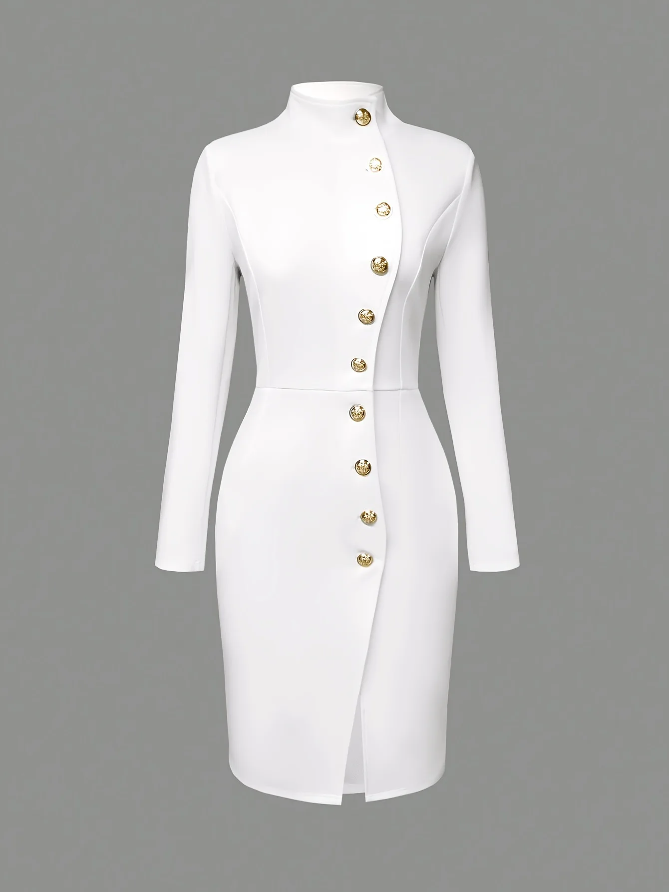 Victoria’s Vogue Women’s Stand Collar Dress Metal Single Breasted Long Sleeve Split Hem Elegant European Retro Autumn Midi Solid Slim Dresses
