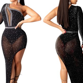 victoria’svogue 2021 Sheer Mesh Patchwork Diamonds One Shoulder Dress See Through High Split Party Vestidos Night Club Wear Elegant Robe