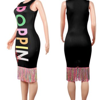 victoria’svogue Colorful Letters Print Tassel Midi Dress with Signature Women Sleeveless Bodycon Vest Club Dresses Casual Long T-shirt