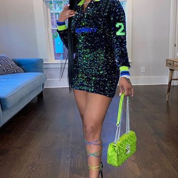 victoria’svogue Letter Print Sequined Sparking Mini Dress S-5XL Turn Down Collar Long Sleeve Skinny Short Vestidos Shining Club Robes