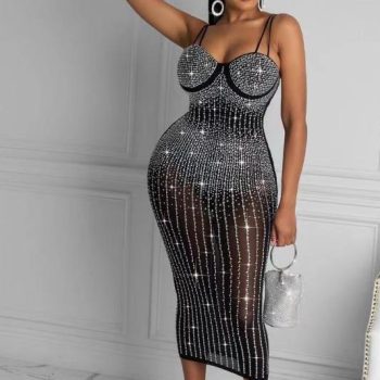 victoria’svogue Diamonds Sheer Mesh Spaghetti Straps Midi Club Party Dress Plus Size S-5XL Bodysuit Lining Women Camis Vestidos