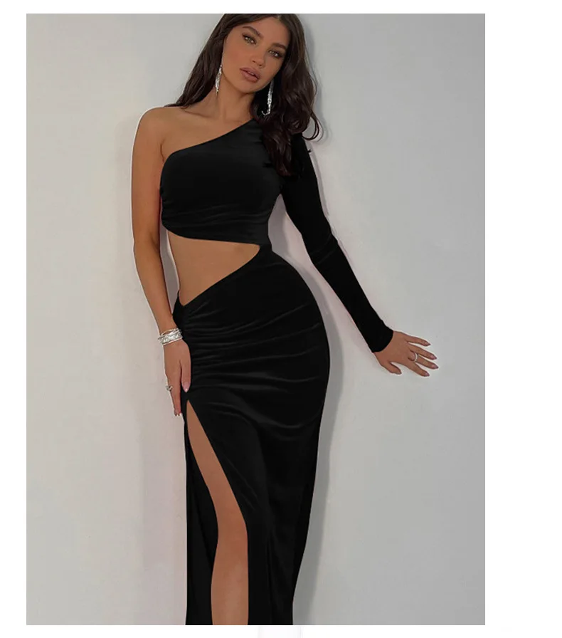 Victoria’s Vogue Diagonal Collar Dress for Women Vintage Black Dresses Single Shoulder Sleeve Tops Dew Waist Skirt Spring Summer Outfit