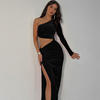 Victoria’s Vogue Diagonal Collar Dress for Women Vintage Black Dresses Single Shoulder Sleeve Tops Dew Waist Skirt Spring Summer Outfit