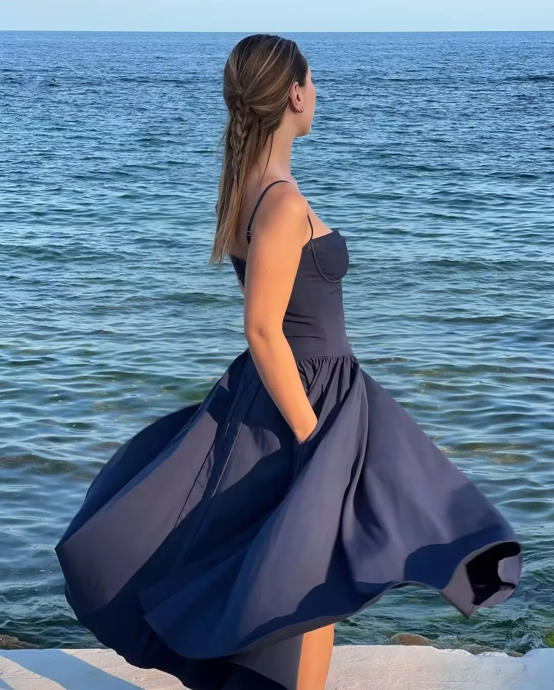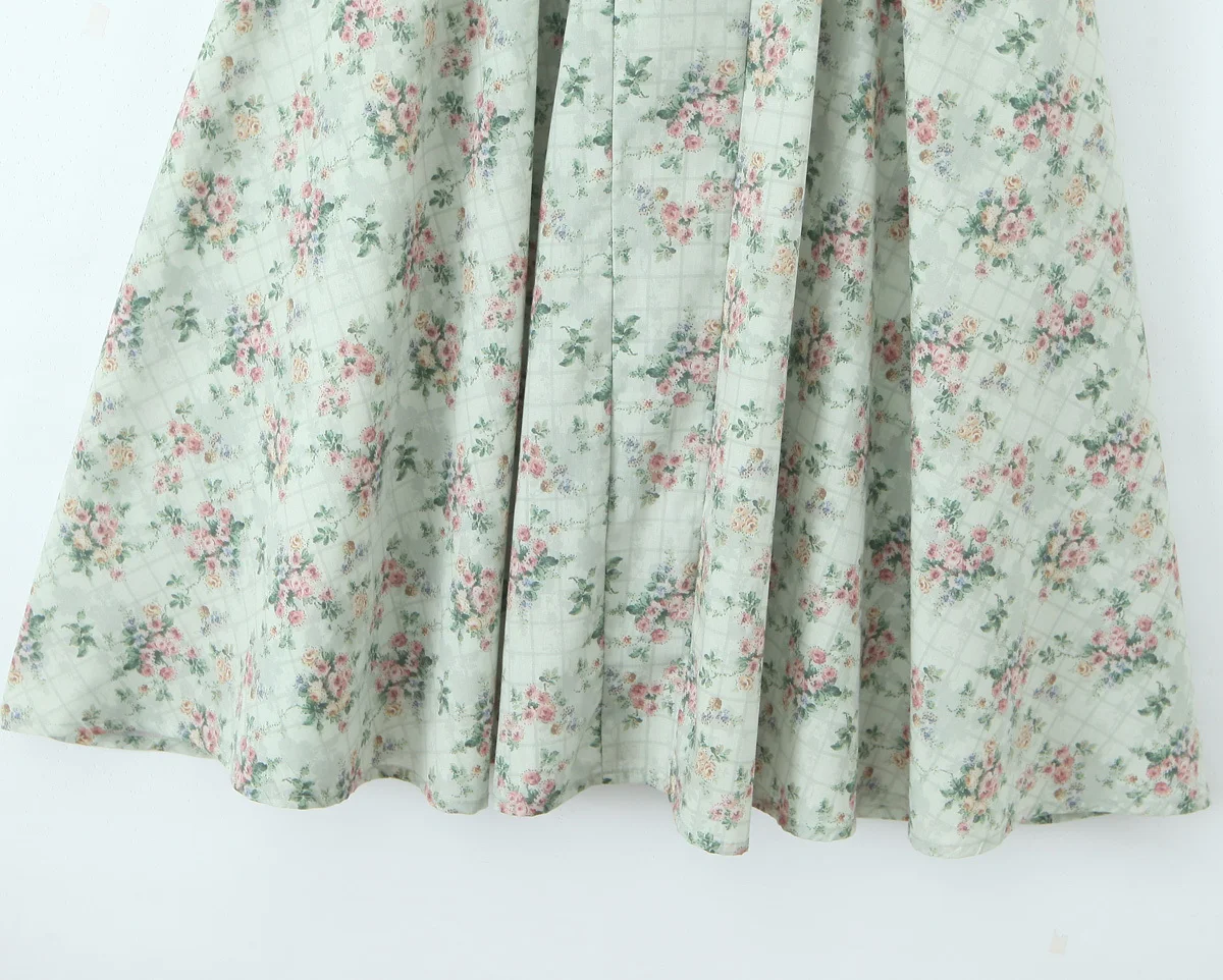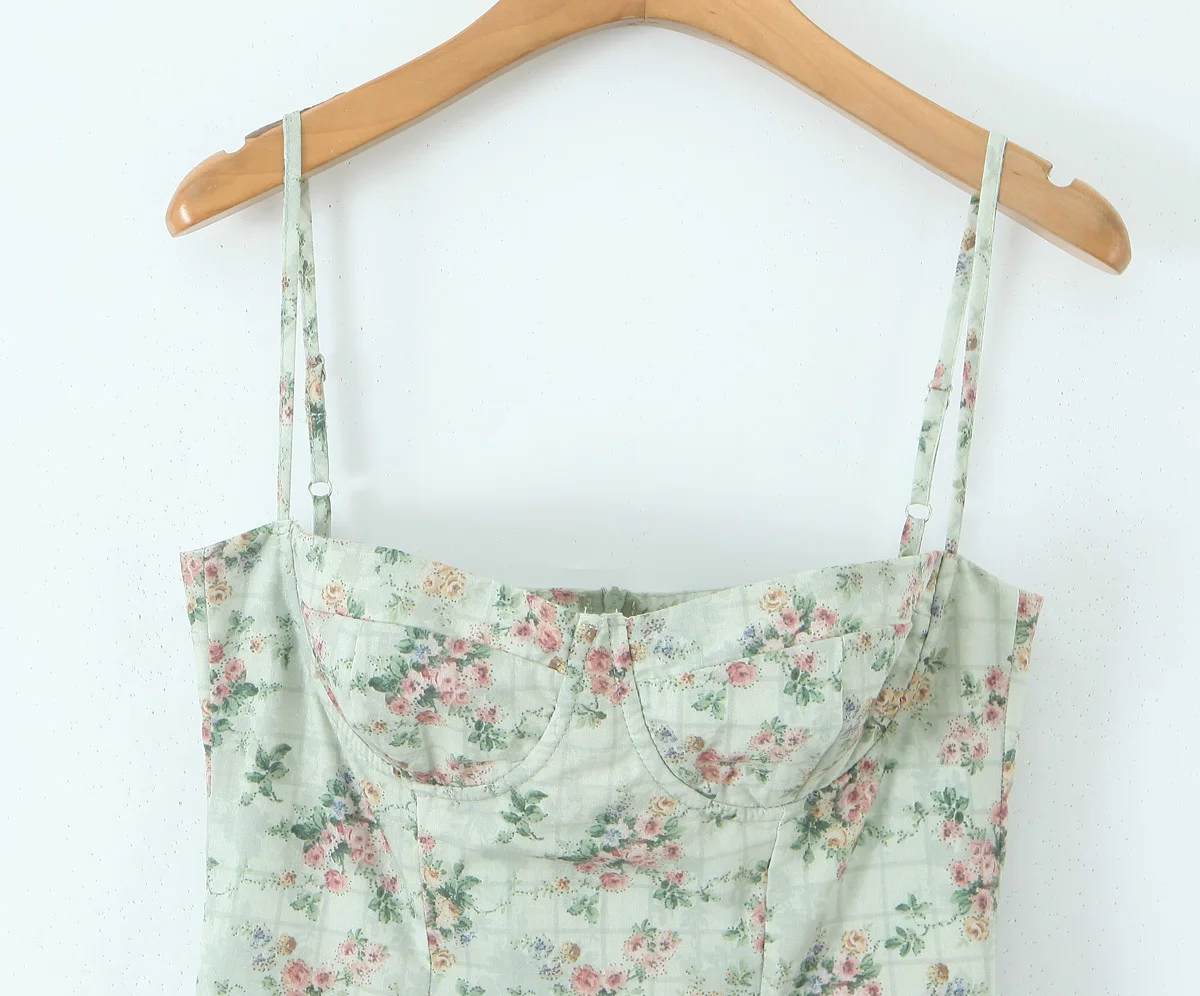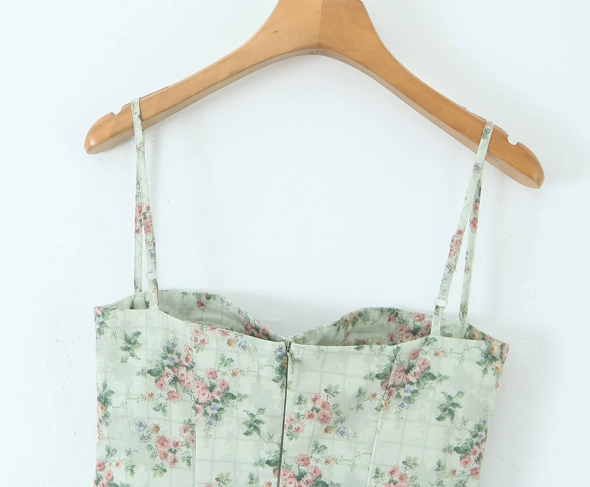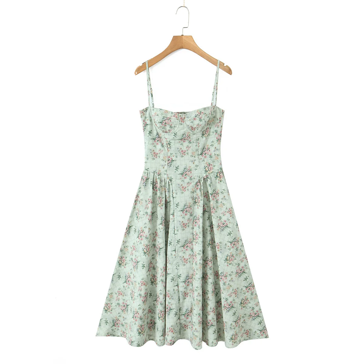 Green Floral Print Sexy Spaghetti Straps Dress Women Low Waist A-line Midi Holiday Summer