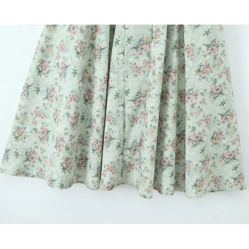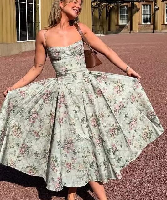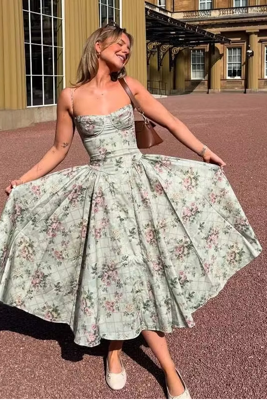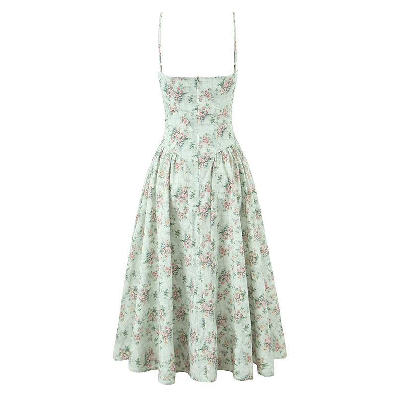Green Floral Print Sexy Spaghetti Straps Dress Women Low Waist A-line Midi Holiday Summer
