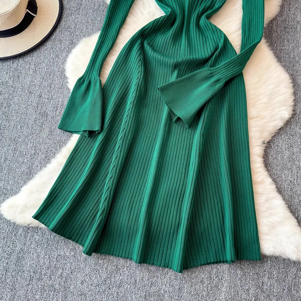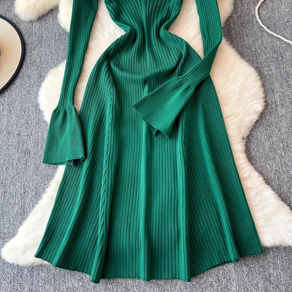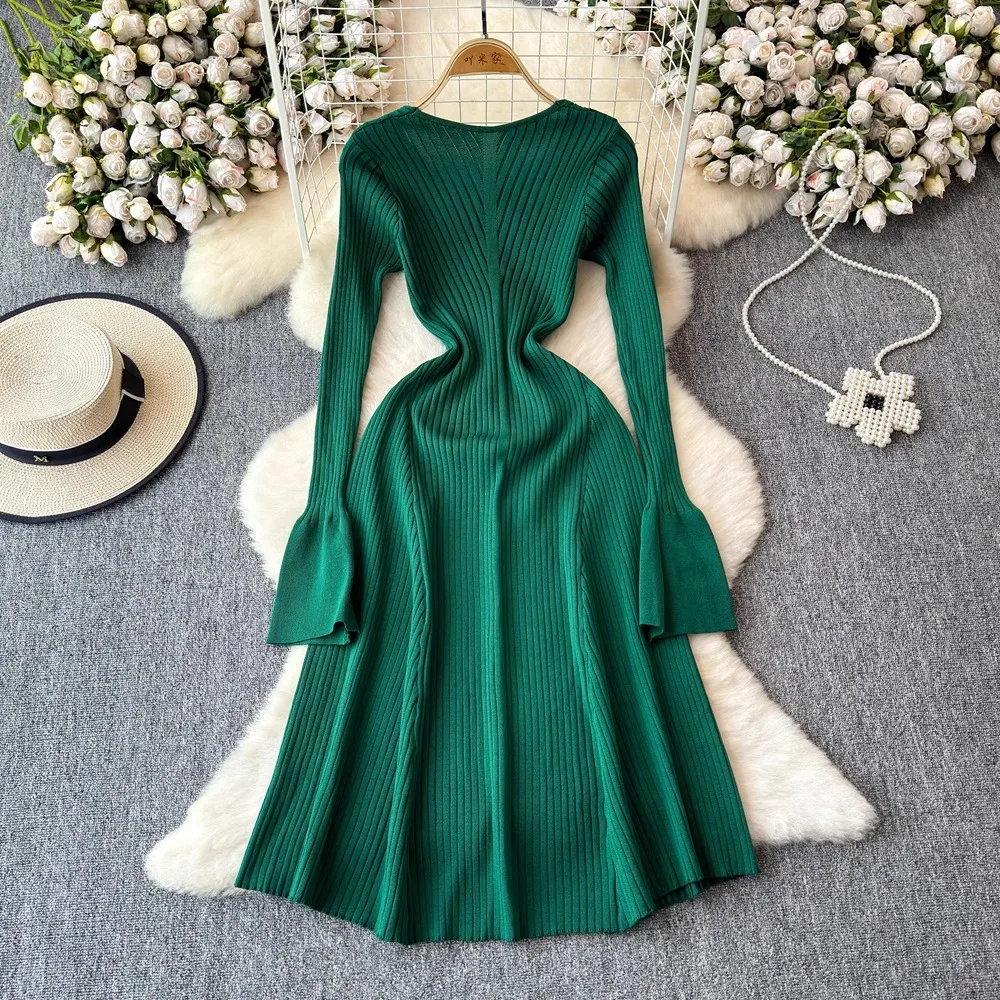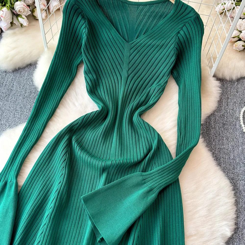 Victoria’s Vogue Women Dress Autumn Winter V-neck Rib Knitted A-line Long Dress Elegant Lady Party Vestidos Sweater Outfits Ro