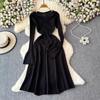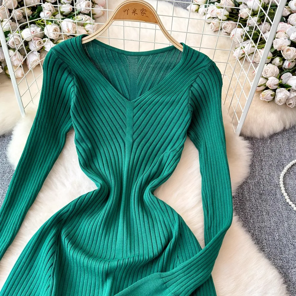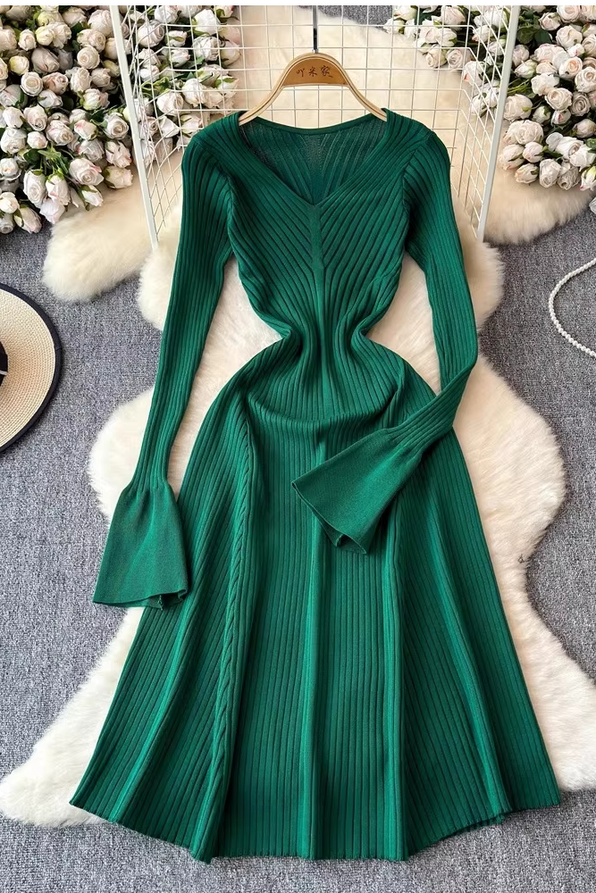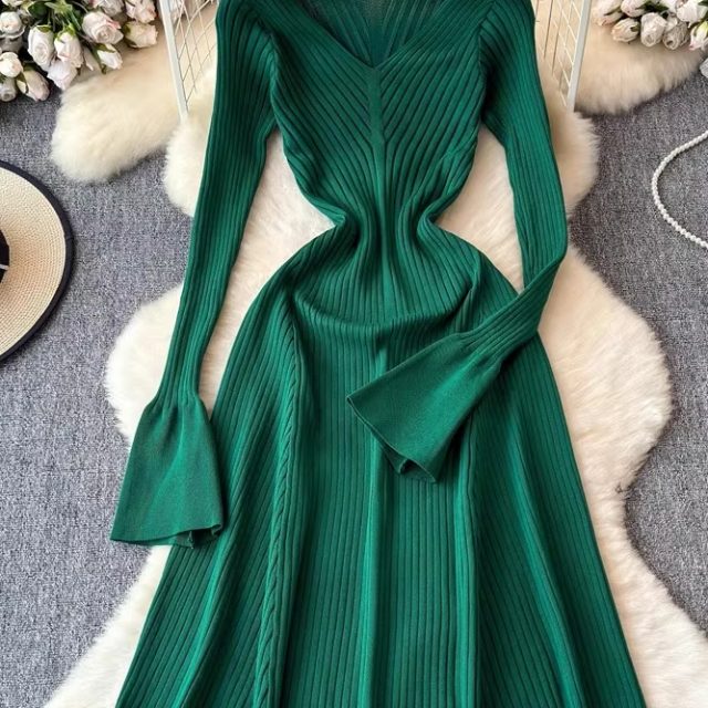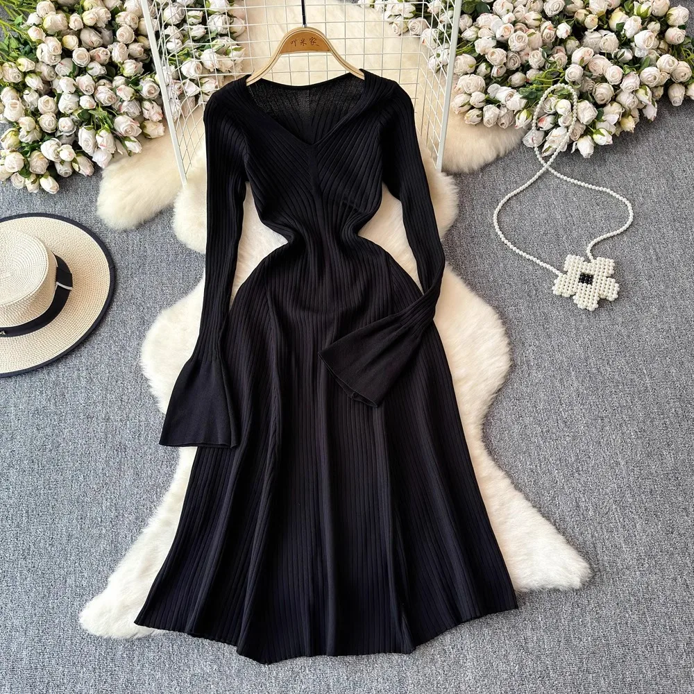 Victoria’s Vogue Women Dress Autumn Winter V-neck Rib Knitted A-line Long Dress Elegant Lady Party Vestidos Sweater Outfits Ro
