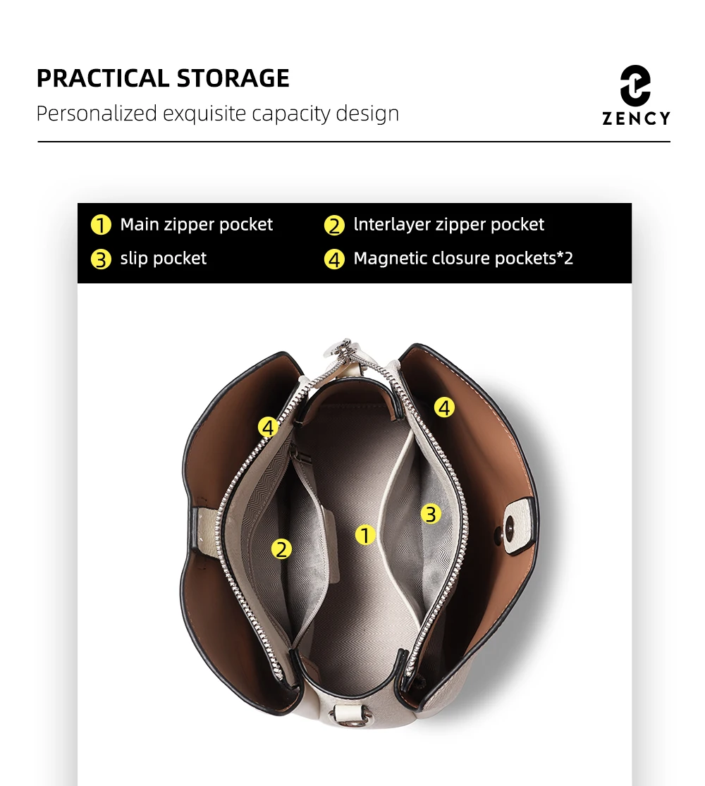 Structure: 1 main zipper pocket,1 interlayer zipper pockets, 1 inside slot pocket, 2 magnetic closure pockets