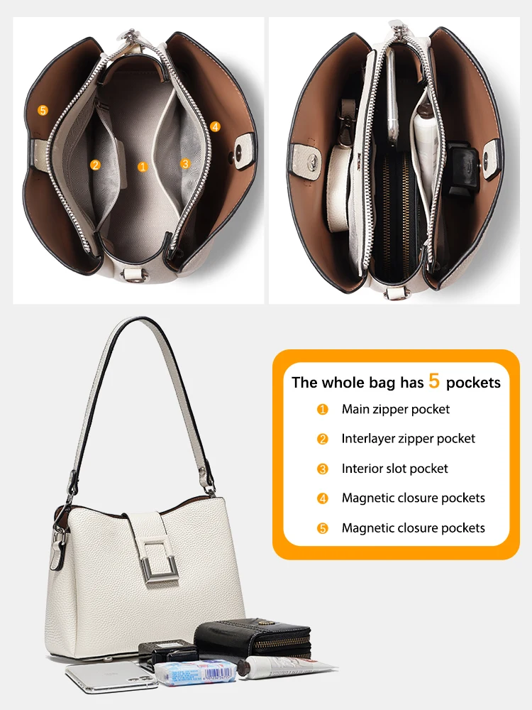 Structure: 1 main zipper pocket,1 interlayer zipper pockets, 1 inside slot pocket, 2 magnetic closure pockets